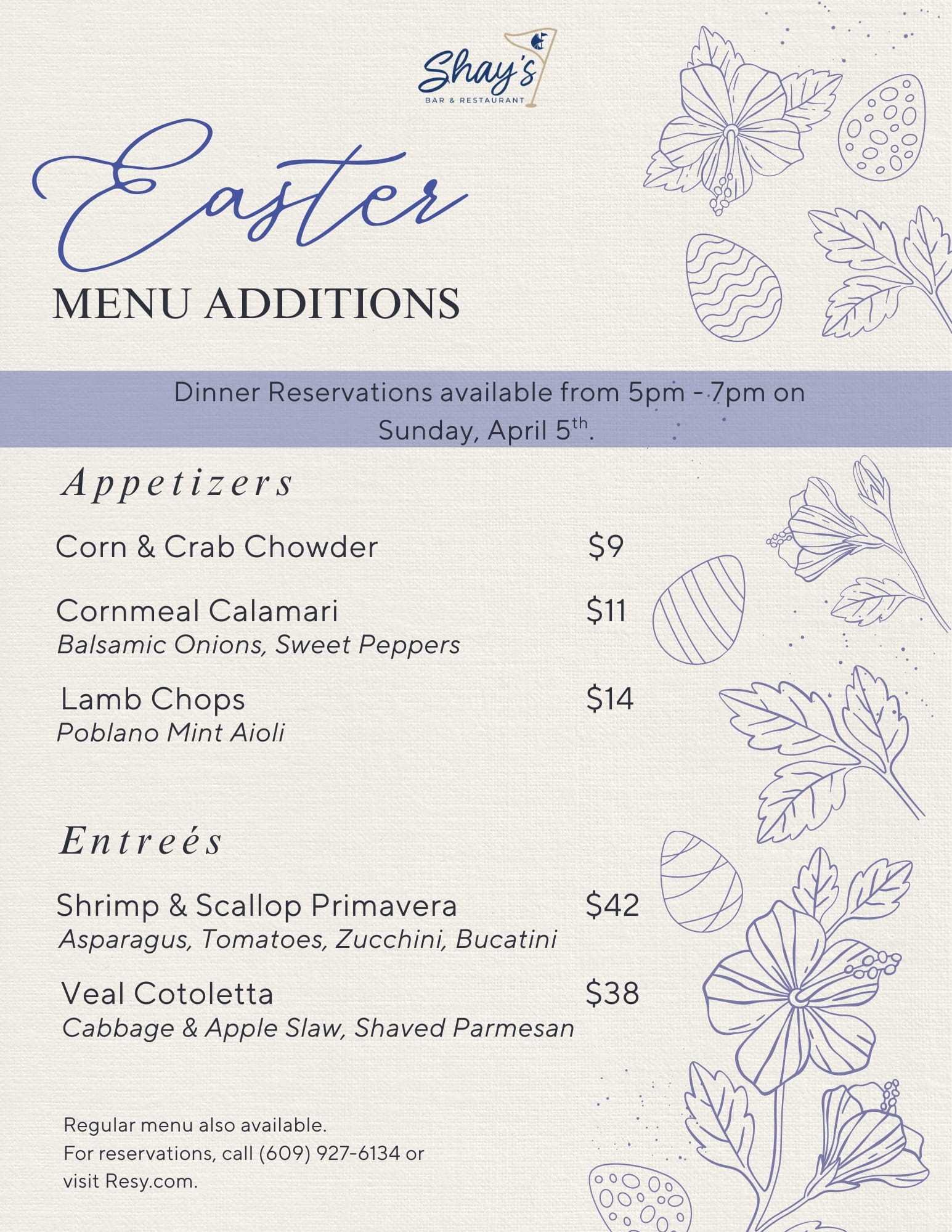 Shay’s is open on Easter with special menu additions! Reservations are available from 5:00pm – 7:00pm. The regular menu is also available. Reservations are required. Please call (609) 927-6134.