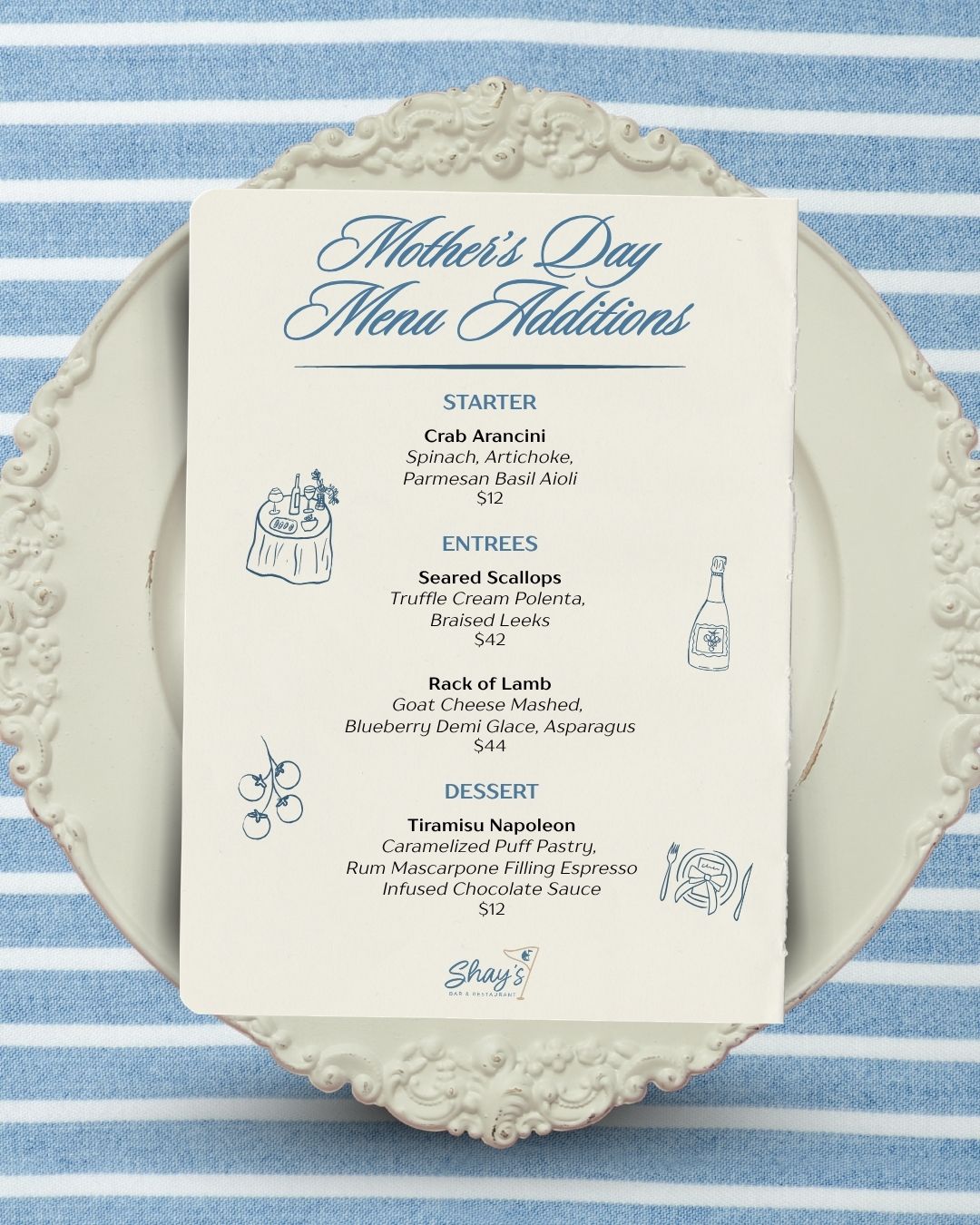 Shay’s is open on Mother’s Day with special menu additions! Reservations are available from 5:00pm – 7:00pm. The regular menu is also available. Reservations are required. Please call (609) 927-6134.