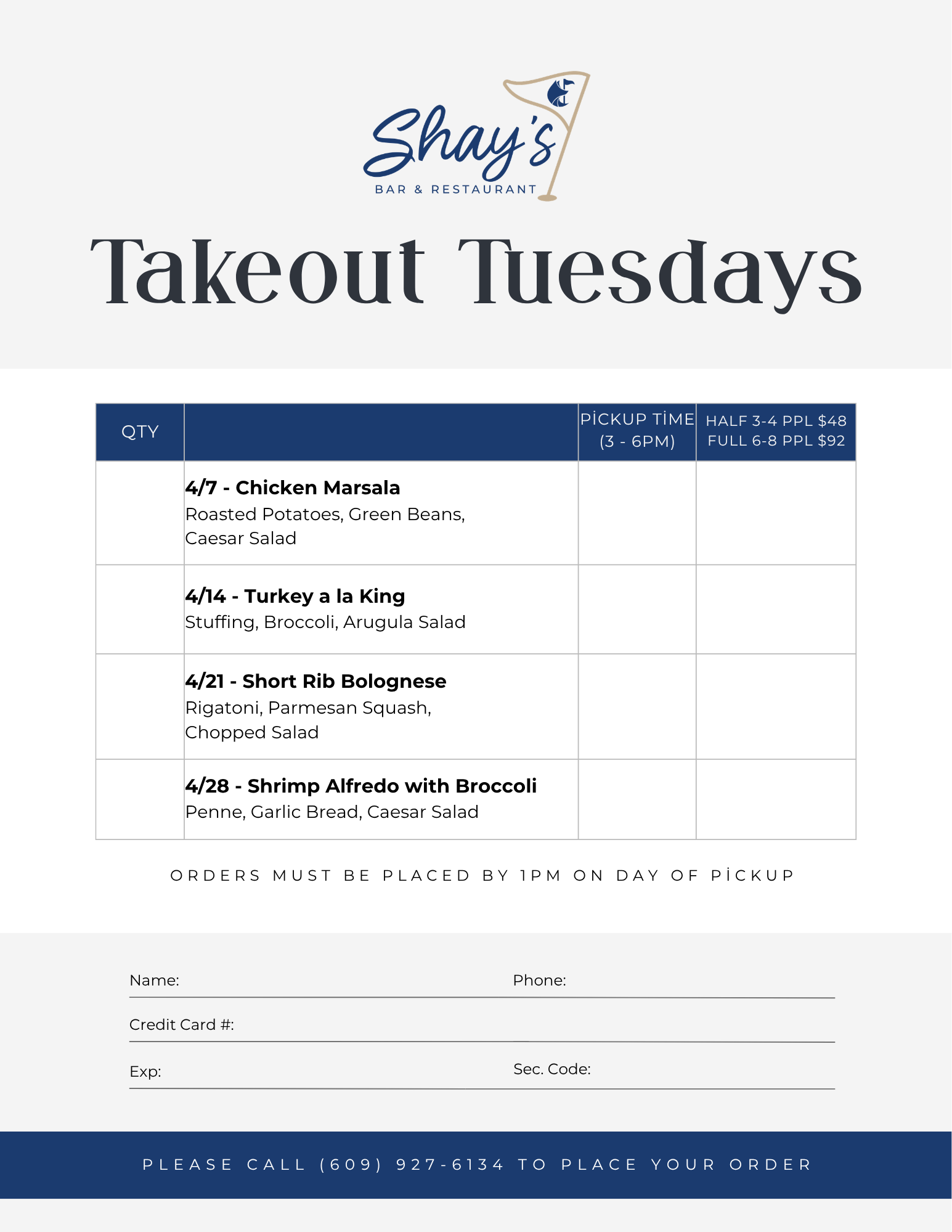 To order, please call (609) 927 – 6134 or email office@linwoodcountryclub.com. Orders must be placed by 1pm on the day of pickup.
